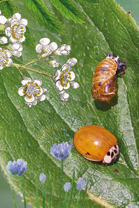Nach der dritten Häutung sind die Larven bereit für die Verpuppung. Sie rollen sich ein und kleben ihren Körper am Holz fest. Farblich können die Puppen ganz unterschiedlich sein. Unsere Zweipunkt-Marienkäfer sind in den meisten Fällen Braun und Schwarz. Je nach Art können die Puppen aber auch rötlich oder gelblich sein. Von Aussen gesehen kann man fast nicht glauben, dass in diesen trockenen Puppen noch Leben ist. Doch so ist es: Im Innern dieser Puppe findet eine verblüffende Verwandlung statt.