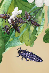 Beinen. Mit einer Lupe kannst du das vielleicht sehen. Vor allem aber haben die Larven einen grossen Appetit nach Blattläusen. Da sie so viel futtern, wachsen die Krabbler natürlich auch