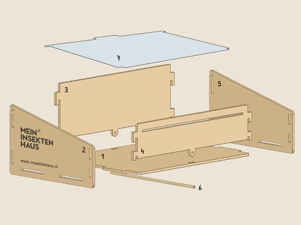 Rückwand (3) und Vorderwand (4) in linke Seitenwand einschieben.