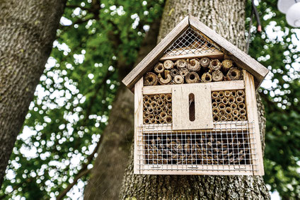 In naturnahen Gärten sieht man sie oft, die Insektenhotels. Gerade für Wildbienen sind diese Insektenhäuser wichtig, da sie diese zum Nisten verwenden. Die Materialien der Insektenhotels, wie Äste mit Löcher und altes Holz sind dazu optimal geeignet.
